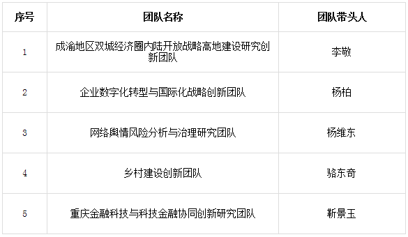 根据《重庆市教育委员会办公室关于开展高校哲学社会科学协同创新团队申报工作的通知》规定的申报条件和限额申报要求,经专家评审,学校审定,确定推荐申报重庆高校哲学社会科学协同创新团队名单,现公布如下: