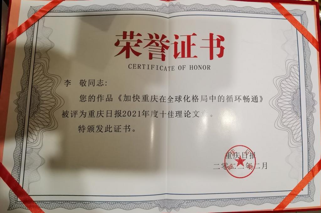 我校专家荣获《重庆日报》2021年度“十佳理论文章”奖