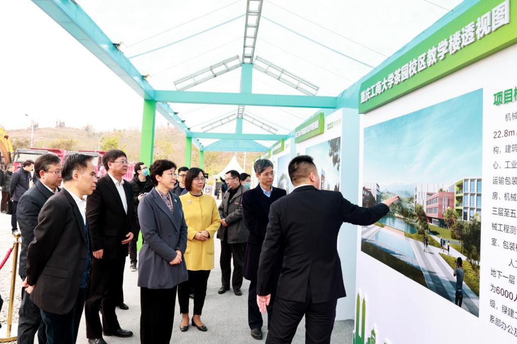 2022年2月28日上午,我校茶园校区建设项目开工仪式在广阳湾智创生态城正式开工。重庆市委常委、统战部部长李静,市委教育工委书记、市教委主任黄政,南岸区、重庆经开区有关领导,我校党委书记李志雄,党委副书记、校长孙芳城出席开工仪式。黄政主持开工仪式。