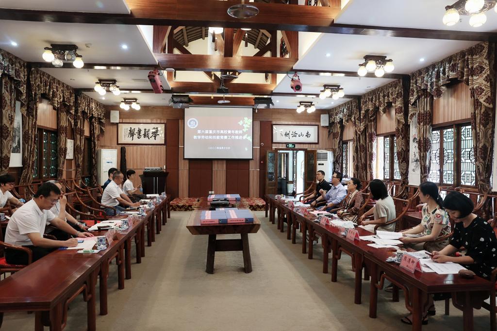 随后,第六届重庆市高校青年教师教学劳动和技能竞赛工作推进会在我校南山书院会议室召开。会上,段远鹏从我校工会重点工作、第六届重庆市高校青年教师教学劳动和技能竞赛筹备情况进行了汇报。重庆市教科文卫工会领导对第六届重庆市高校青年教师教学劳动和技能竞赛筹备工作进行了指导。双方就技能大赛筹备工作进行了沟通和交流。