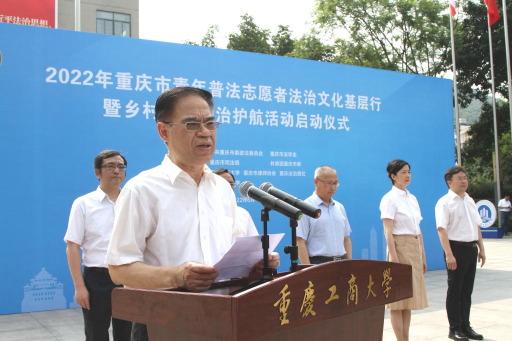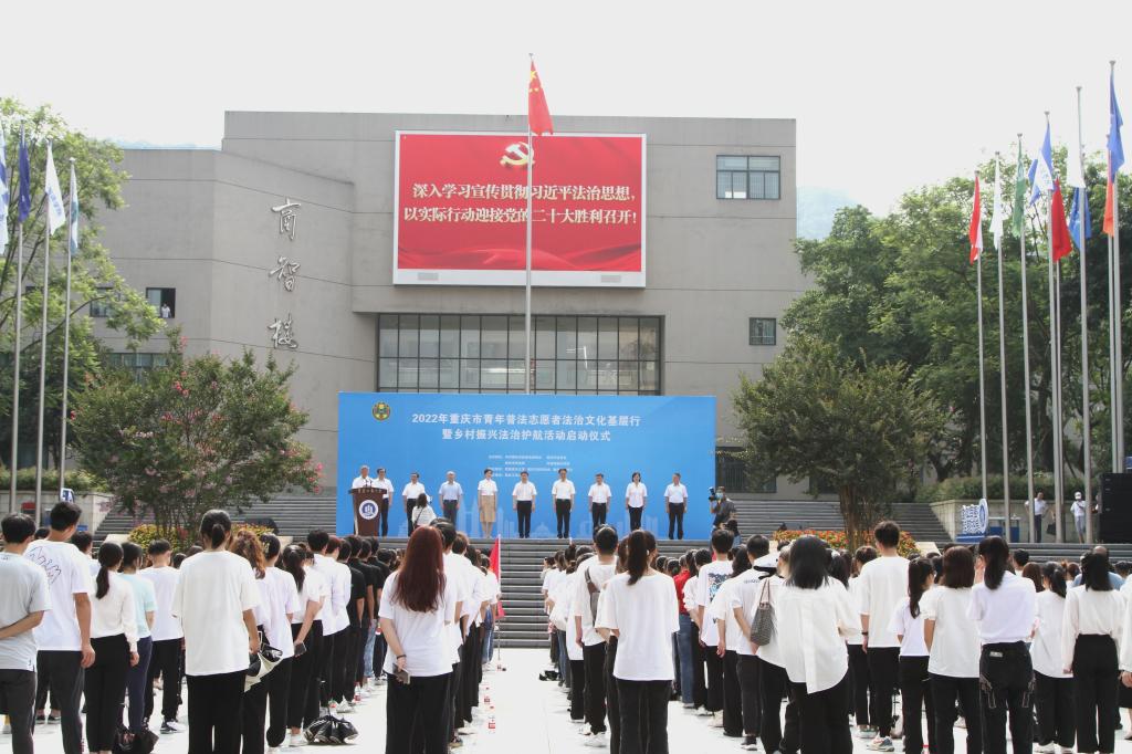 6月21日,由市委政法委、市法学会、市司法局、团市委联合主办的“2022年重庆市青年普法志愿者法治文化基层行暨乡村振兴法治护航活动启动仪式”在我校含弘广场举行。来自米兰网站法学与社会学学院、西南政法大学民商法学院、重庆警察学院、重庆大学法学院、西南大学法学院、重庆邮电大学网络空间安全与信息法学院等法学院校大学生志愿者代表、市律师协会青年普法志愿者代表,市法学会民法经济法研究会、统筹城乡发展法治研究会、重庆法治报社乡村振兴法治护航中心,以及主城核心区的法学会、司法局、团区委,市乡村振兴局、团市委、市级政法各部门有关负责人以及我校有关领导参加了启动仪式。