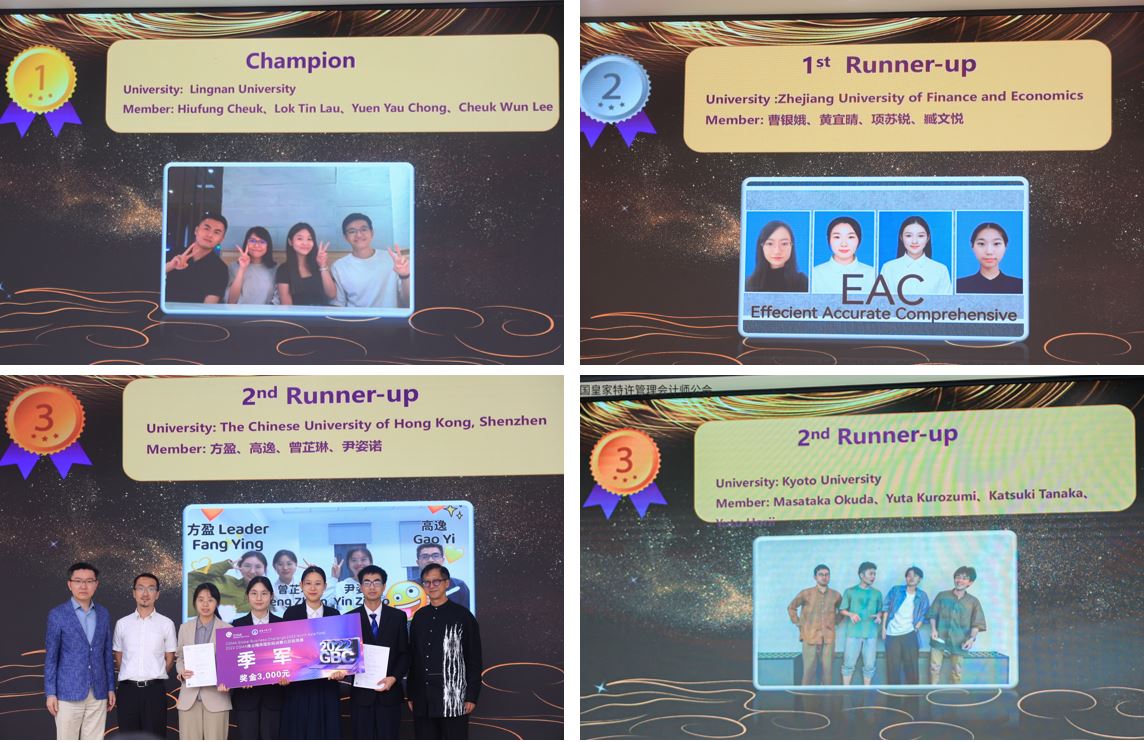 最终香港岭南大学404队夺得冠军,亚军及季军则分别由浙江财经大学EAC队和香港中文大学(深圳)Aduiduidui队、日本京都大学Kyoto Kailba队获得;“最佳商业潜质个人奖”则由404队的Hiufang Cheuk同学获得;优胜奖获奖队伍为米兰网站Navigator队和Polaris队、东北财经大学Elite队、广东外语外贸大学Illusive Stars队、澳门大学Excellence队、蒙古财经大学Ufecomptes队。王天若评委还当即对11位参赛选手发出了就职邀请,其中包括我校两支团队的5名同学。