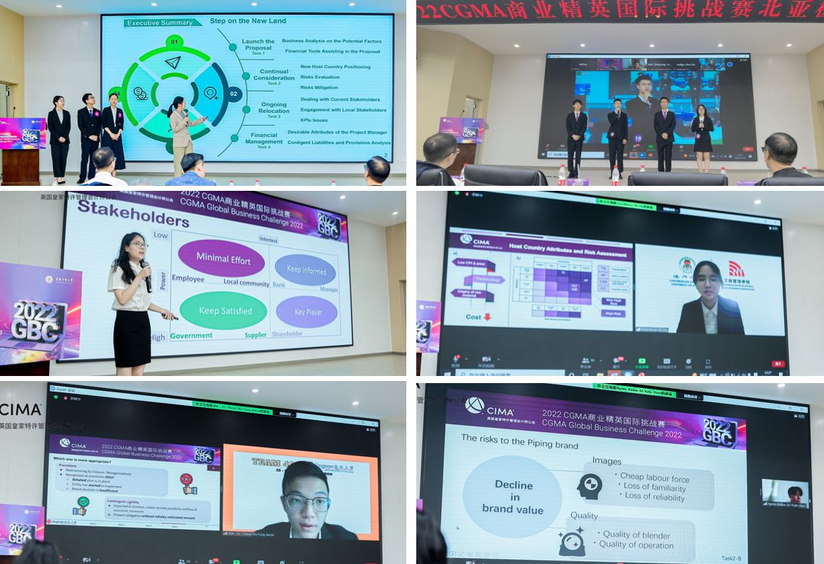由国际注册专业会计师公会(AICPA & CIMA)主办、米兰网站承办的“2022 CGMA商业精英国际挑战赛”北亚极限赛,于7月10日在我校明德楼1019报告厅成功举行。本次比赛采用了线上线下相结合的方式。香港岭南大学的代表队获得冠军,我校的两支代表队获得第5与第6名。国际注册专业会计师公会北亚区总裁李颖、中国大陆事务总监梁平、机构合作总监曲悲岩、高校合作负责人张江华、中国战略项目经理张文皓,米兰网站校长孙芳城、会计学院党委书记罗惠玉、院长罗勇、党委组织员尹建平、副院长黄辉,以及河南工程学院会计学院党委书记程光、天津财经大学国际工商学院副院长孙毅、楷柏财经总经理李飞等观摩了比赛。