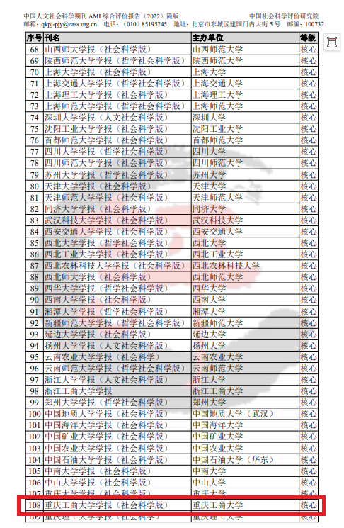 《中国人文社会科学期刊AMI综合评价报告(2022年)》与中文社会科学引文索引(CSSCI)、《中文核心期刊要目总览》均为我国人文社科期刊领域有权威性和影响力的综合评价体系。本轮AMI综合评价体系设置了吸引力、影响力、管理力、荣誉状况、文章状况、同行评议、编校质量、特色化等31个指标,对38个学科2174种学术期刊和304种学术集刊展开客观、全面、综合的评价。其中,“综合.高校综合性学报学科”共收录379种期刊,其中顶级期刊1种,权威期刊5种,核心期刊104种,扩展期刊104种,入库期刊165种。我校学报社科版位列核心期刊序列。