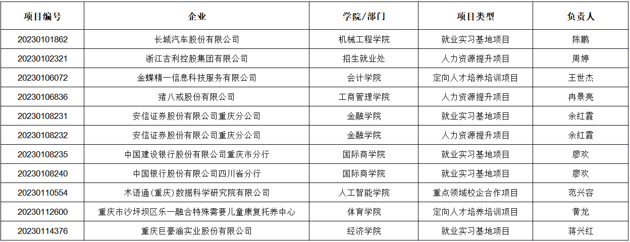4月6日,教育部高校学生司发布《关于公布第二期供需对接就业育人项目立项名单的通知》(教学司函〔2023〕6号),我校与长城汽车股份有限公司、浙江吉利控股集团有限公司、金蝶精一信息科技服务有限公司、猪八戒股份有限公司、安信证券股份有限公司重庆分公司、中国建设银行股份有限公司重庆市分行、中国银行股份有限公司四川省分行、术语通(重庆)数据科学研究院有限公司、重庆市沙坪坝区乐一融合特殊需要儿童康复托养中心、重庆巨豪渝实业股份有限公司10家用人单位联合申报的人力资源提升、就业实习基地、定向人才培养培训、重点领域校企合作项目11个项目获批立项,较2022年新增9项。