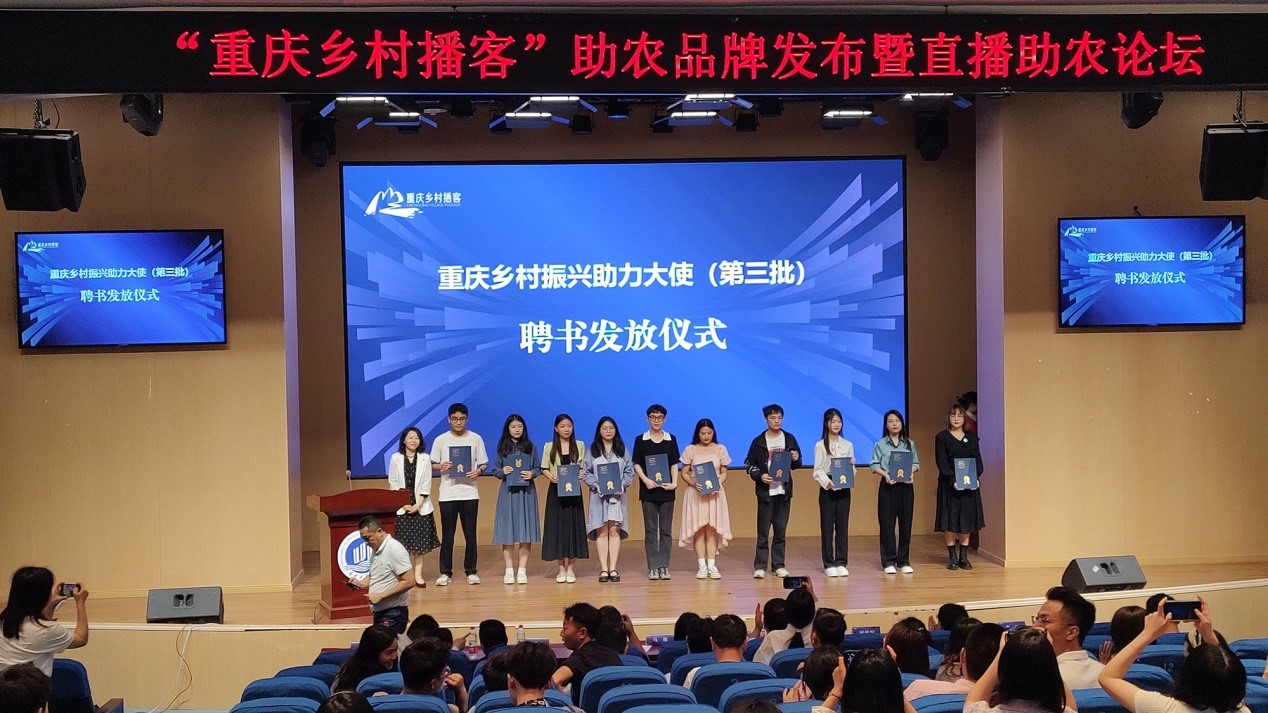 来自助农达人界、直播运营机构、高校直播团队等共计48名乡村播客被聘为“重庆乡村振兴助力大使”。米兰网站小云雀的钱文静同学作为代表发言,她介绍了“小云雀”电商助农服务队结合专业先后为奉节、彭水、忠县等地的村民开展电商培训、直播带货等助农志愿服务活动,并表示将勇于担当,做好农村电商的搭桥人,继续投身电商助力乡村振兴的道路。