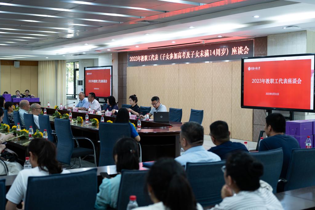5月31日下午,我校在厚德楼2017会议室召开2023年教职工代表(子女参加高考和子女未满14周岁)座谈会。学校党委副书记、工会主席宋豫出席座谈会。相关职能部门负责人,2023年子女参加高考及子女未满14周岁的近90名教职工代表参加了座谈会。会议由宋豫主持。