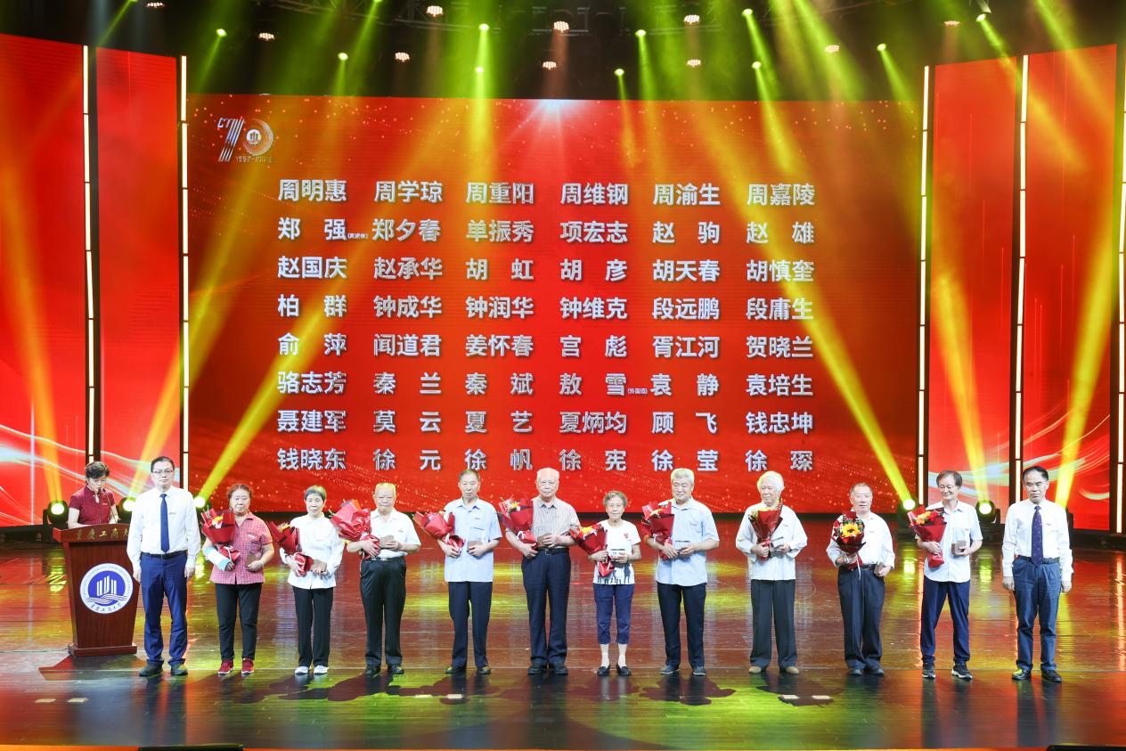 李志雄和温涛为“光荣在校50年”榜单人物代表颁发纪念品。校友代表为“光荣在校50年”榜单人物代表献花。