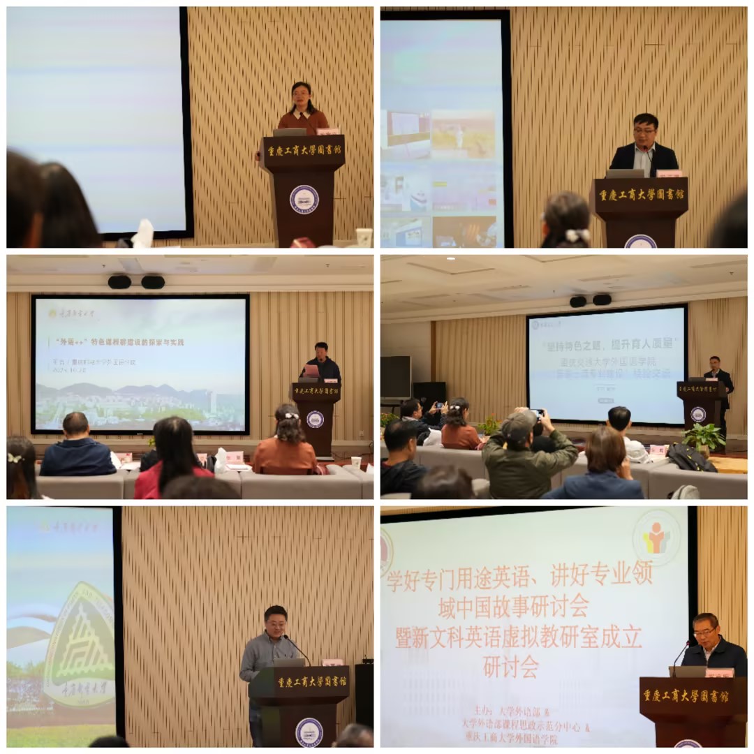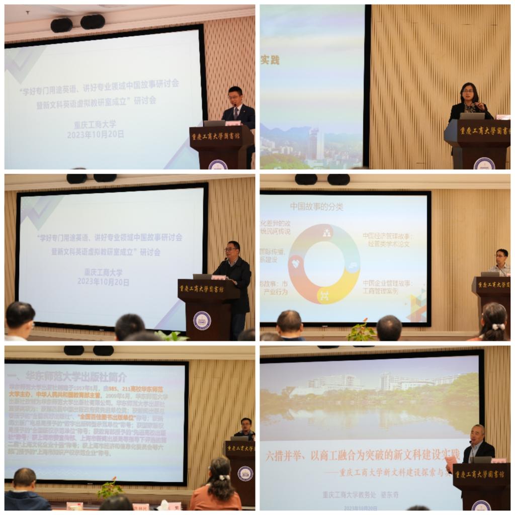 重庆“一带一路”经济技术合作中心理事长兼主任杜小东作了题为《“一带一路”倡议十周年:国际投资与服务贸易的语言支撑》的报告。重庆交通大学外国语学院院长曾洪伟教授以《坚持特色之路,提升育人质量---重庆交通大学外国语学院国家级一流专业建设》为题分享了国家一流专业建设的经验。重庆邮电大学外国语学院王怡博士作了题为《“外语+”特色课程群建设的探索与实践》的汇报。米兰网站外国语学院副院长刘繁以《财经特色 融合创新——大学英语财经课程体系建设》为题分享了大学英语财经课程体系建设经验和成果;我校大学外语部主任罗志高教授讲述了如何用财经专门用途英语讲好中国故事。福建亿学教育科技集团有限公司大西南总监周宗强先生、华东师范大学出版社宜立特教材研发中心副总编朱林民先生分别从产教融合和外语教育课程思政的角度介绍了讲好中国故事教学资源建设。