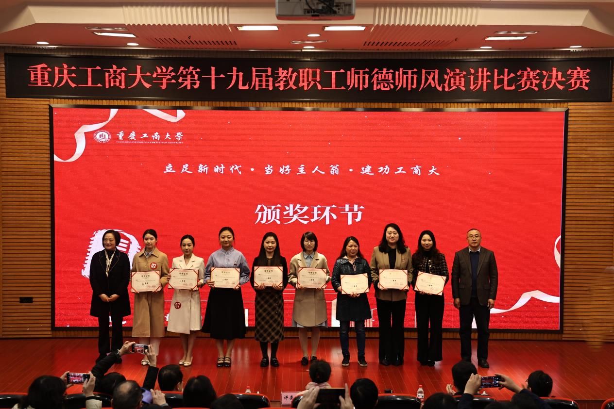 12月1日下午,由校工会、党委教师工作部联合举办的“立足新时代·当好主人翁·建功工商大”系列活动之第十九届教职工师德师风演讲比赛在博智楼7200学术报告厅举行。学校党委书记曾维伦,党委副书记宋豫,学校各学院党委书记、各部门工会主席以及教职工代表共计150余人观看了比赛。比赛邀请了重庆市教科文卫体工会副主席袁菁霞,学校党委常委、组织部部长郑夕春,党委常委、统战部常务副部长陈松,党政办公室副主任、档案馆馆长蒋年韬,党委教师工作部部长、人事处处长林文军,党委宣传部副部长陆嘉,团委副书记胡婧婷担任评委。