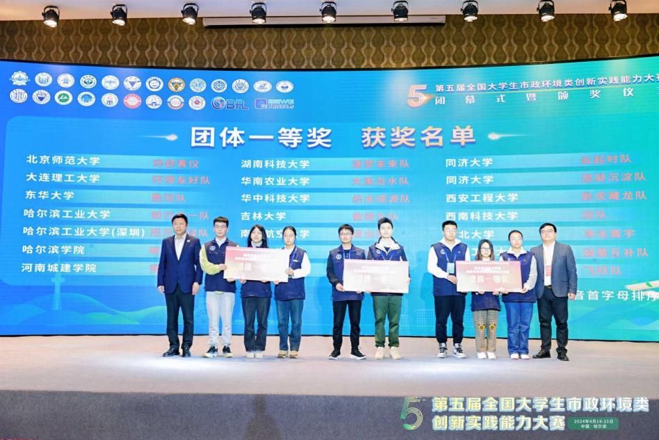 4月20日--4月21日,第五届全国大学生市政环境类创新实践能力大赛全国总决赛在哈尔滨举行。由我校环境与资源学院环境工程系2021级学生阙忠阳、孙琦、刘忠鑫3位同学组建的“碱基互补队”在全国总决赛中荣获团队一等奖(图,左一),环境与资源学院范子红教师荣获“优秀指导教师”称号。