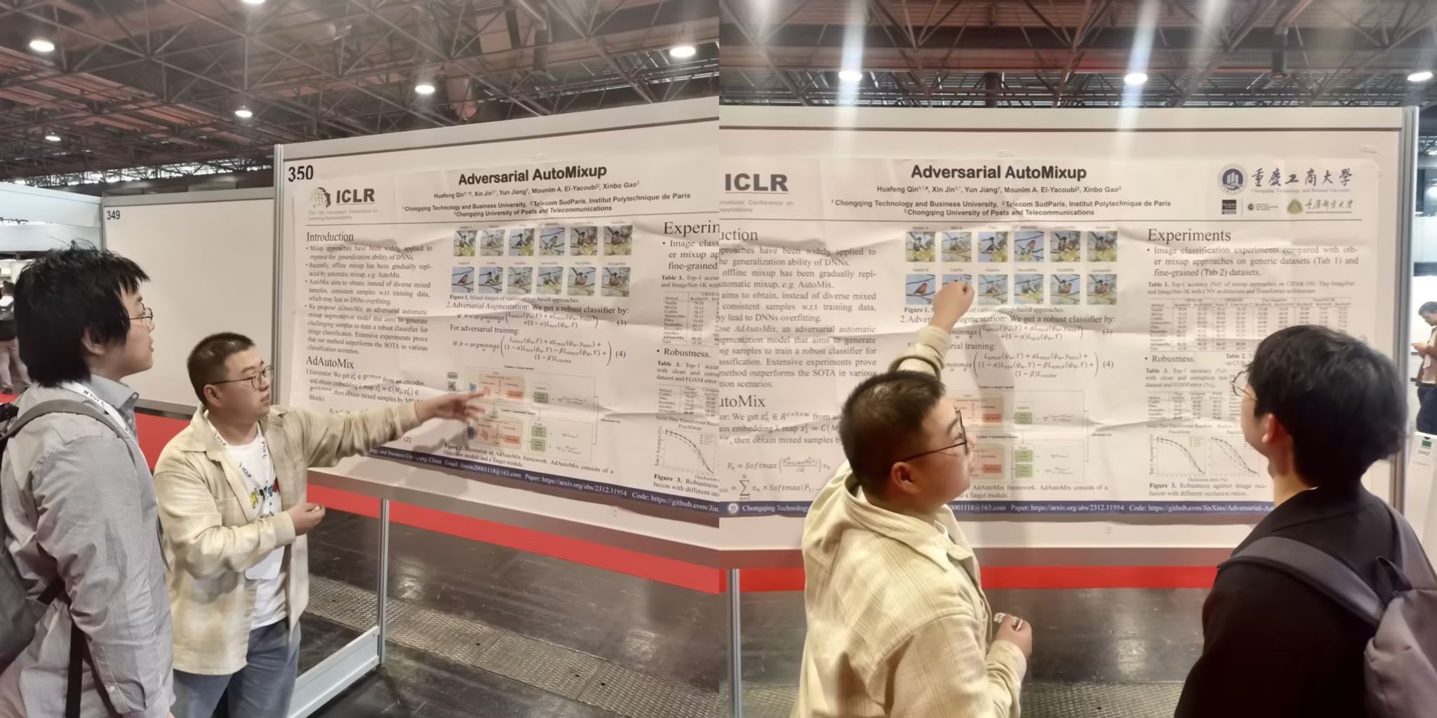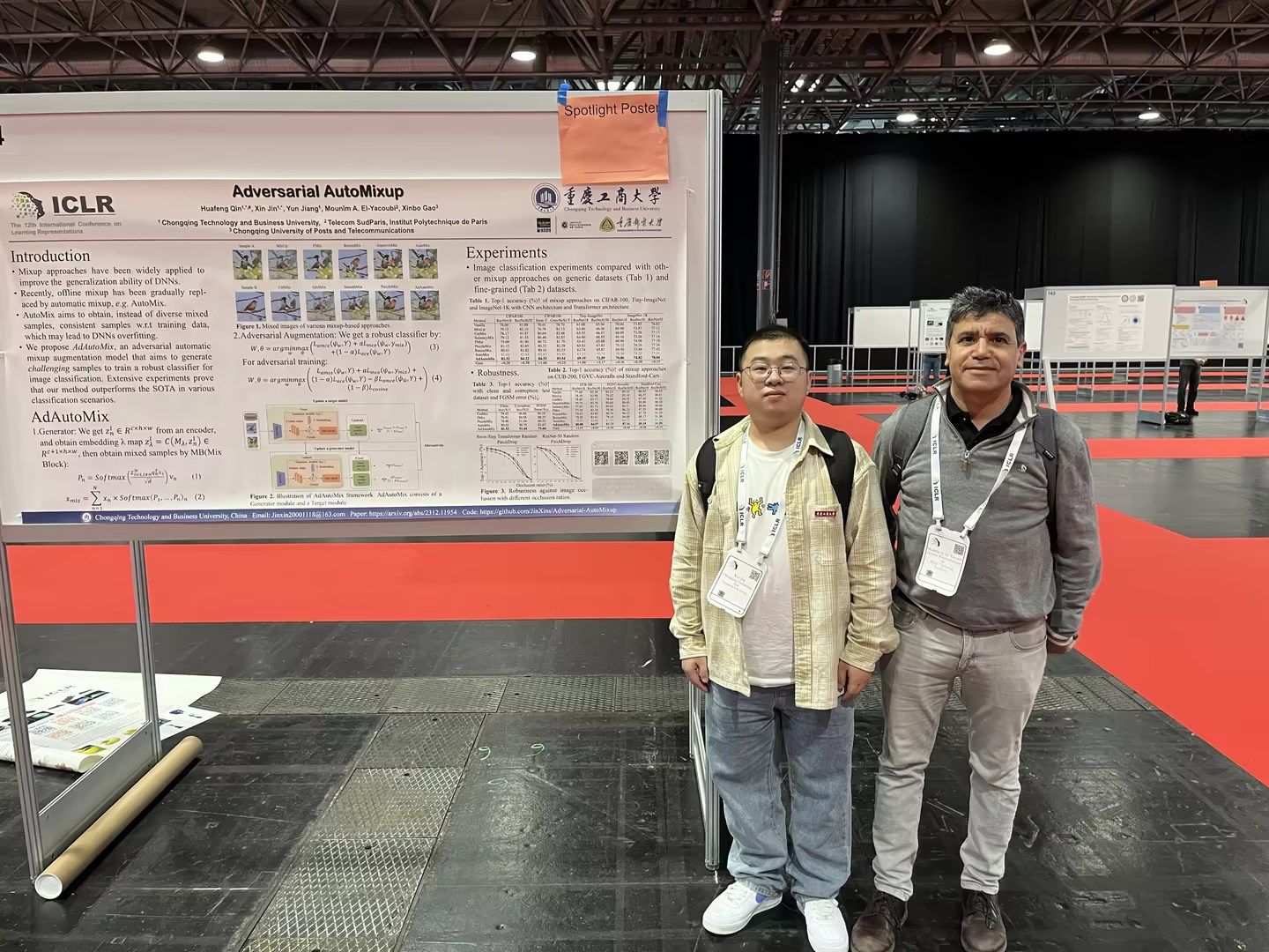 近日,我校人工智能学院2022级软件工程专业研究生金鑫在第12届国际表征学习大会(ICLR 2024)上发表了题为“Adversarial AutoMixup”(对抗自动混合)的研究成果,并入选亮点论文(Spotlight),该论文为计算机视觉数据增强做出了创新贡献。会议于今年5月7日至11日在奥地利首都维也纳举办。海报展示期间,该论文受到了来自包括麻省理工学院、牛津大学、清华大学、苏黎世联邦理工学院、OpenAI等世界顶尖大学和科技公司的关注和赞赏。
