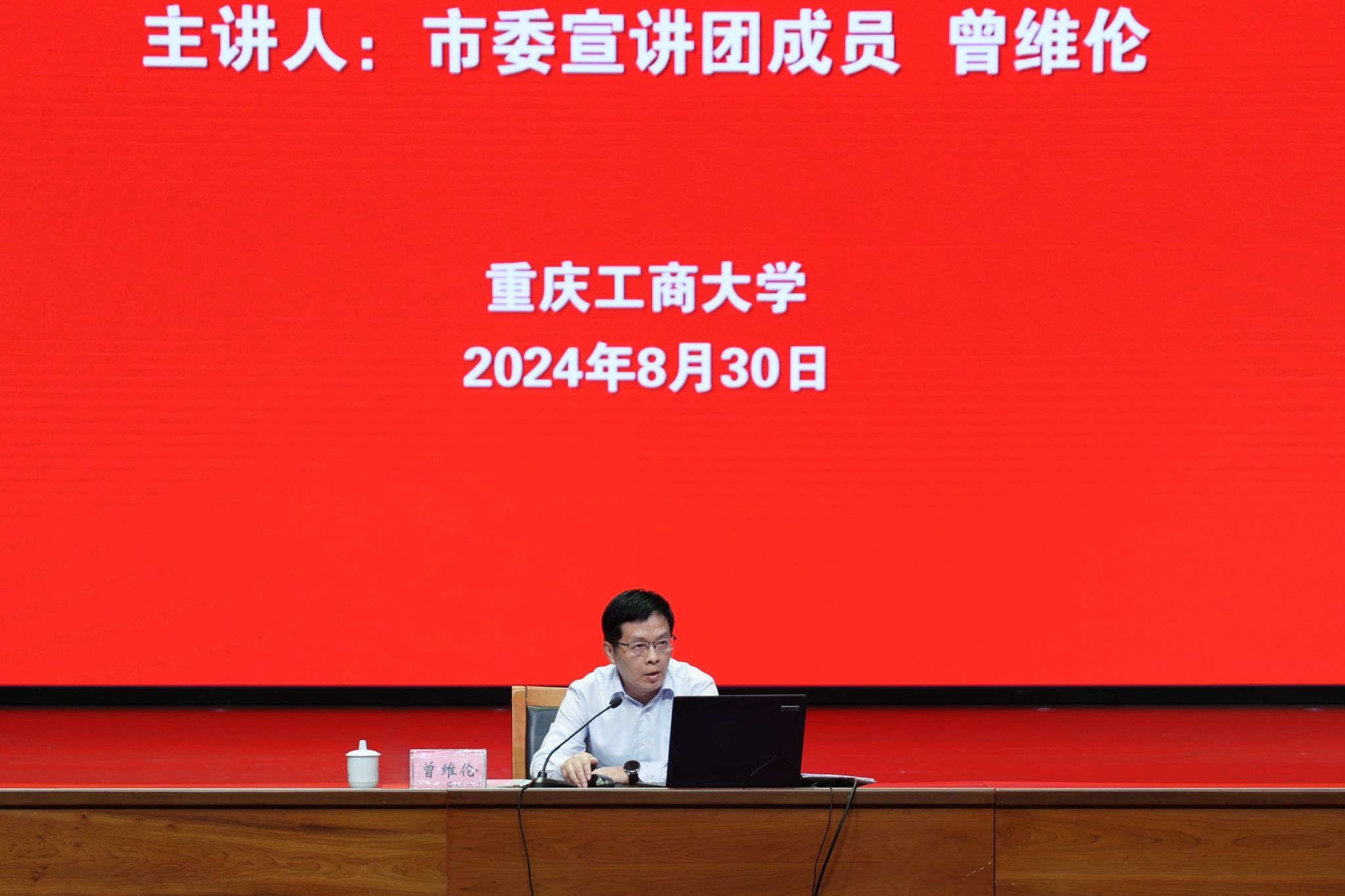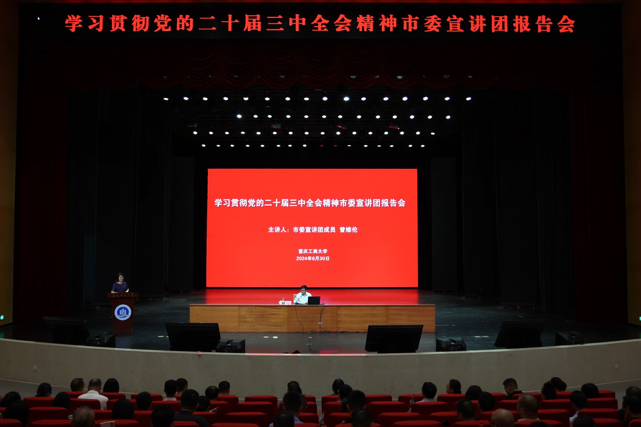 市委宣讲团成员、学校党委书记曾维伦作宣讲报告,学校党委副书记宋豫主持报告会。