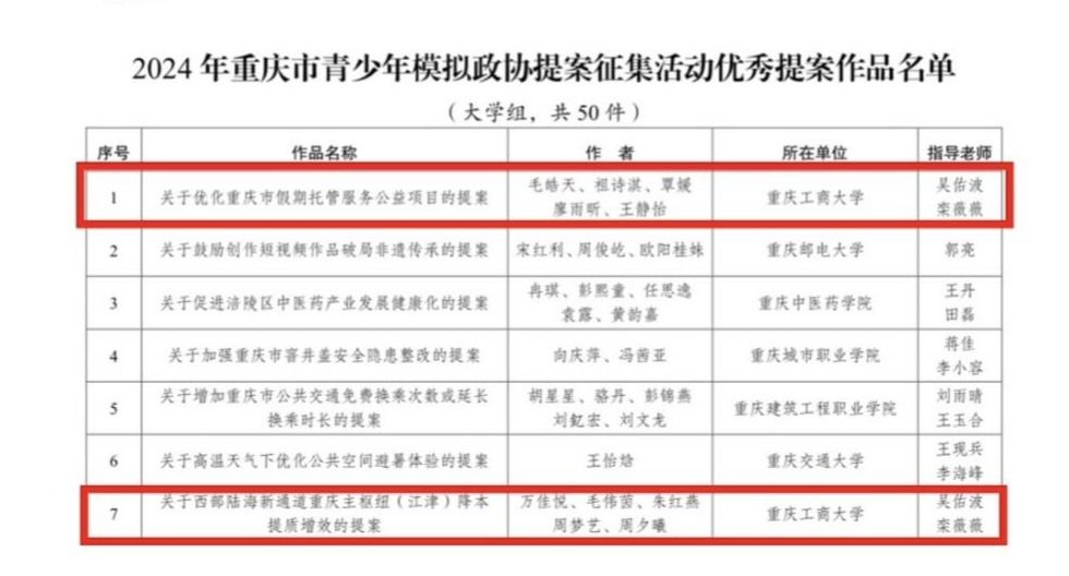 获奖作品《关于优化重庆市假期托管服务公益项目的提案》(作者:毛皓天、祖诗淇、覃媛、廖雨昕、王静怡)立足青年视角,关注社会急难愁盼问题,为优化重庆市假期托管服务公益项目建言献策。获奖作品《关于西部陆海新通道重庆主枢纽(江津)降本提质增效的提案》(作者:万佳悦、毛伟茵、朱红燕、周梦艺、周夕曦)围绕习近平总书记关于高水平共建西部陆海新通道的重要指示精神,聚焦重庆江津的通道建设情况及挑战,为助力西部陆海新通道重庆主枢纽降本提质增效建言献策。