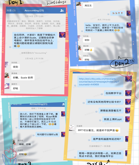 老师们在收到直播上课和在线学习的要求后,通过线上讨论,视频会议等方式进行各种软件试用效果的比较,总结适合自己课程的软件和网络教学平台。《会计学(全英文)》也同时进行了和学生的在线测试和互动,选取了企业微信的群直播方式进行直播,同时选择了新道云课堂的网络平台作为备用,如果出现企业微信卡顿的情况,则切换为备用平台,保证网络直播课程的流畅和效果。