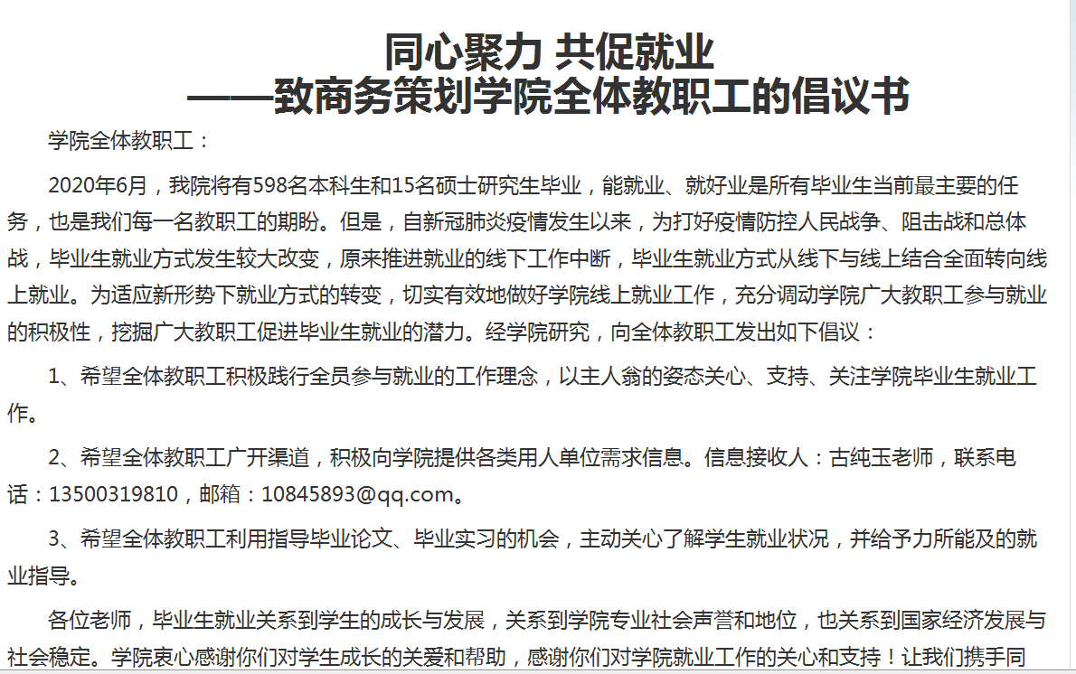 自新冠肺炎疫情发生以来,全球经济下行压力巨大,高校就业形势十分严峻,毕业生就业方式发生较大改变,原来推进就业的线下工作中断,毕业生就业方式从线下与线上结合全面转向线上就业。为适应新形势下就业方式的转变,切实有效地做好学院线上就业工作,商务策划学院积极研判形势,多次召开就业工作会议,多措并举推进毕业生就业。