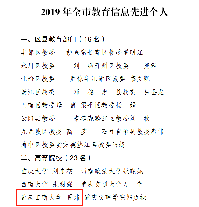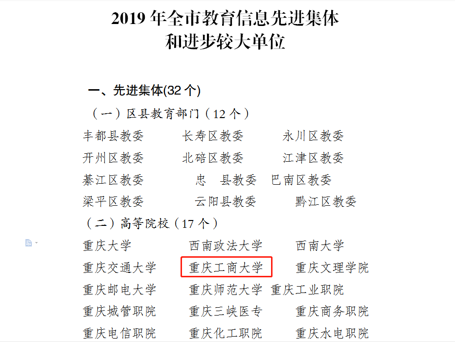 日前,重庆市教育委员会办公室公布了《关于2019年教育信息工作情况的通报》,我校被评为2019年全市教育信息工作先进集体,胥炜同志被评为全市教育信息工作先进个人。