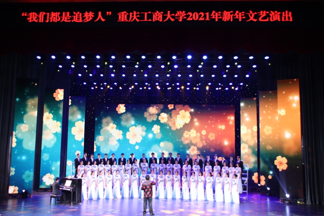 演出在大学生艺术团合唱分团带来的合唱《世界上唯一的花》中拉开序幕。管乐重奏《肖斯塔科维奇5首双小提琴重奏之第一、三乐章》旋律优美,萦绕耳畔;舞蹈《我们也有一面旗》生动讲述“党史”故事,弘扬红岩精神;小品《谁的快递》生动展现快递员父亲与大学生女儿间的家庭关爱、父女情深;校园十佳歌手的歌曲串烧让现场观众感受到青春的力量;精彩朗诵《风从南山起》带领观众感受改革开放史的强烈光芒;民乐小合奏《二泉映月》触动心境;小合唱《雪花的快乐》,在音乐的曲调下将诗人徐志摩的情感表达得淋漓尽致,触动心灵;讲述节目《战“疫”两地书》,诉说在疫情期间 “云世界”里,大家手拉着手,围成一堵墙,把病毒隔离在外,将爱温暖在心的感人情景;朗诵《爷爷的插旗山》深情讲述传承祖辈信念,让国旗高高飘扬在最高的山;舞蹈《纸扇书生》展现从古至今的青春追梦人。梦想是路,通向成功的门,我们都在追梦上旅途上,由大学生艺术团、天木槿音乐社、校园十佳歌手共同带来的歌曲《我们都是追梦人》,为晚会划上圆满句点。