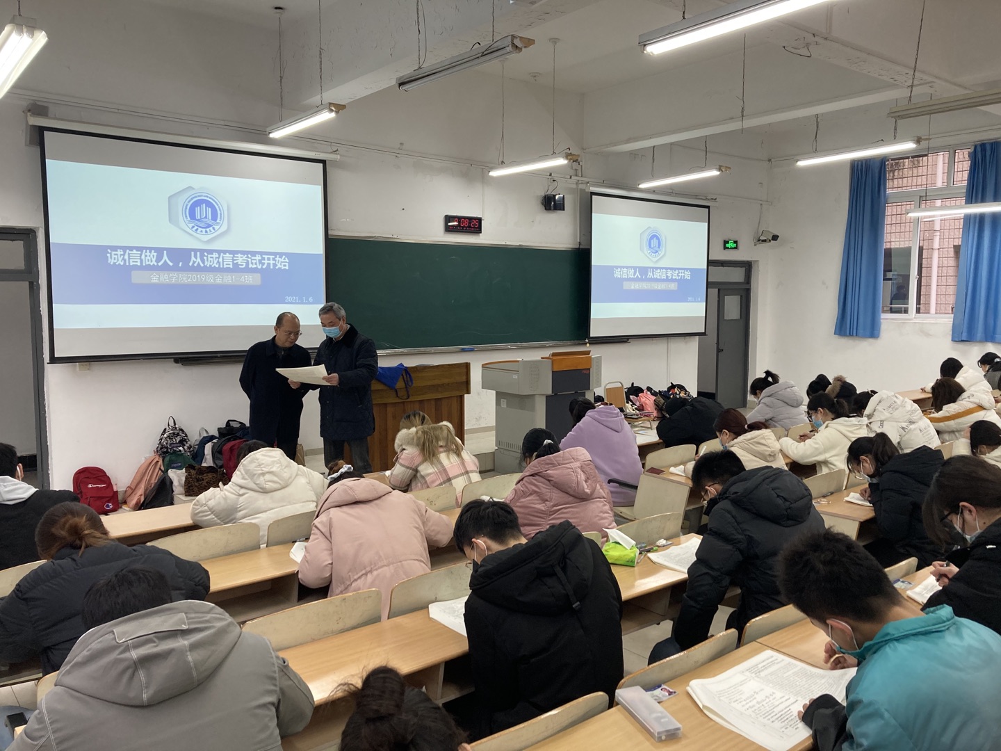 1月6日,金融学院2019级金融学专业共计159名学生自愿申请在博智楼07207和07208教室举行《金融学》课程的“免监考”诚信考试,这是金融学院首次举行“免监考”诚信考试。副校长李国军、校长助理谭松涛到场巡考。