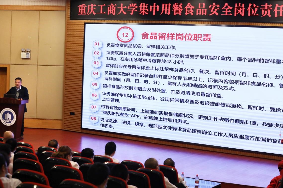 为保障学校师生食品安全,健全食品安全管理制度,明确食品安全工作责任,加强食品安全管理,根据《重庆市市场监督管理局 重庆市教育委员会关于建立学校及幼儿园集中用餐食品安全岗位责任制度的通知》(渝市监发〔2021〕14号)要求,我校于3月8日召开校长办公会,讨论通过了《米兰网站集中用餐食品安全岗位责任制度》,将上级部门对校园食品安全要求进行细化、分解,明确从校长到一般食品安全从业人员等相关责任人员的食品安全工作任务;对校园食品安全主体责任、第一责任、主要责任、直接责任等进行清晰地界定,确保做到责任落地、落实。3月19日下午,我校在博智楼7200报告厅召开培训会,后勤处处长沙云对《米兰网站集中用餐食品安全岗位责任制度》逐条、逐项并结合案例进行培训讲解,要求每个岗位做到人人知晓、责任清楚、任务明确。后勤处饮食科,校内各餐饮公司负责人、幼儿园负责人、各食堂经理、各食堂班组骨干人员等200余人参加了培训会。