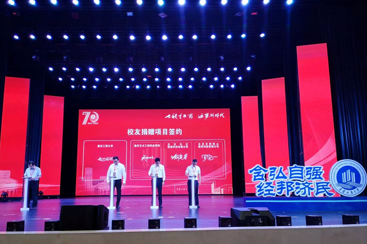 1988级装潢设计专业校友、重庆艺术工程职业学院院长周勃,2006级人力资源专业校友、北京京师筑心教育科技有限公司董事长罗宋成,1994级国际贸易专业校友、北京勾正数据科技有限公司董事长喻亮星与学校签订捐赠协议。赵骅代表学校向三位校友颁发捐赠证书。