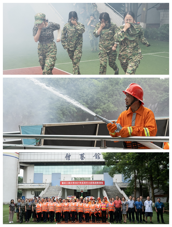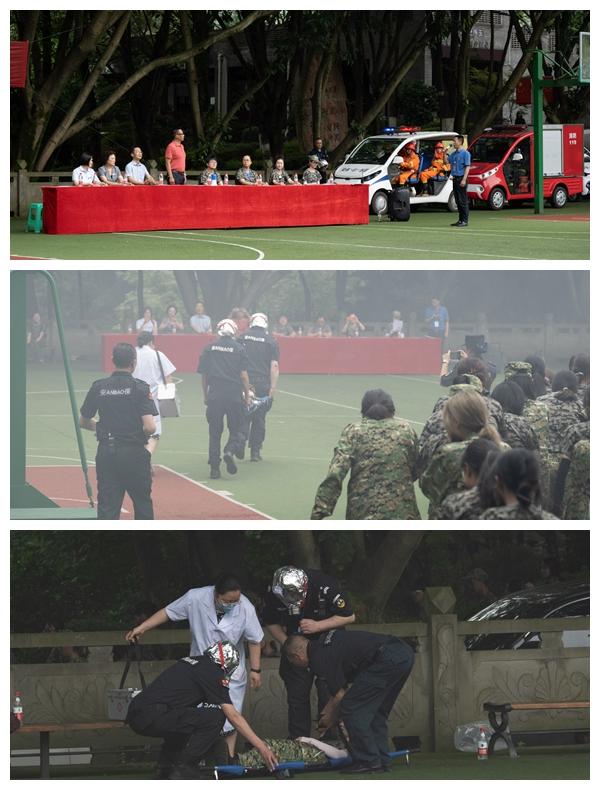 为了进一步普及安全知识,增强安全意识,提高自防自救能力,检验相关部门处置突发事件的能力,提升学校安全管理水平,7月9日上午,党委保卫部(保卫处)、党委学工部(学生处)在学校体艺馆联合举行了米兰网站2021年反恐灭火应急疏散演练,部分正在军训的学生、军训教官和老师、安保队员、平安校园志愿者、保卫干部、物业管理人员和校医院医务人员共计3300余人参加了演练。