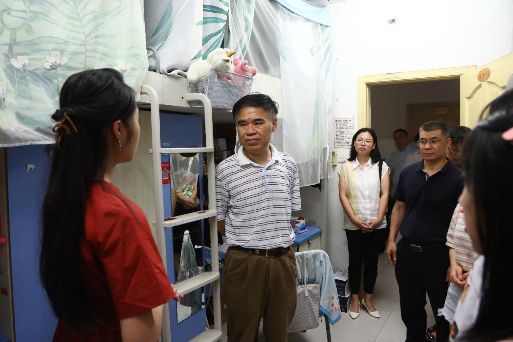 在厚德楼相关部门办公室、值班室,李志雄详细询问了工作人员值班情况,对大家持续坚守岗位表示肯定和感谢。在保卫处,李志雄一行听取了暑期安稳工作情况汇报,并代表学校向在高温烈日下仍然做好校园巡逻、排查、值守工作的一线工作人员表示关心慰问,嘱咐大家注意防暑,保证良好身体和精神状态,确保暑期校园安全稳定。在兰园食堂,李志雄认真了解食堂暑期各项工作运转情况、师生就餐情况等,对大家辛勤工作给予肯定并强调,暑期要继续把好食品安全关,为留校师生提供良好的就餐等后勤服务。在兰花湖片区,李志雄一行就师生留校情况、疫情防控等工作与留校工作人员细致交流,希望大家站好暑期这一班岗,确保假期校园平稳运行。随后,李志雄一行来到南岸校区留学生公寓、南区学生公寓,与留校学生亲切交谈,了解同学们暑期学习安排、生活情况与需要学校解决的困难,嘱咐同学们暑期认真学习习近平总书记“七·一”讲话,持续开展党史学习,紧抓专业课程学习。当得知杨雨晴同学来自河南时,李志雄十分关心其家乡受灾及救援情况,详细询问家中现状并表示,学校高度关注此次河南暴雨受灾区域的同学,将多措并举帮助受灾同学渡过难关。