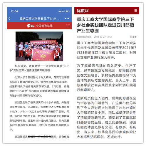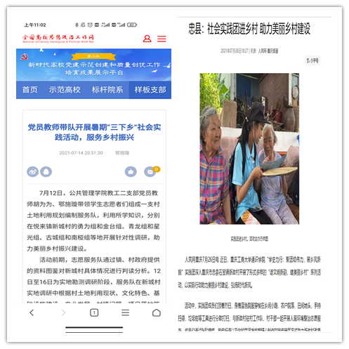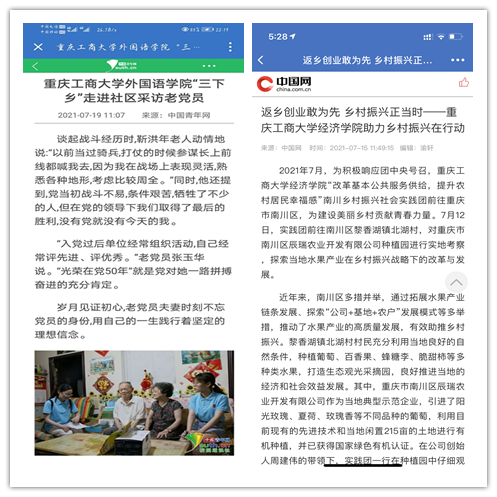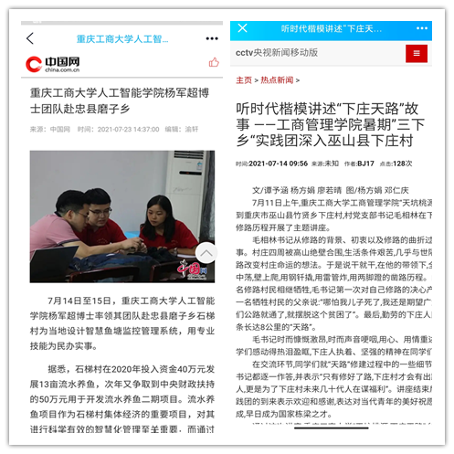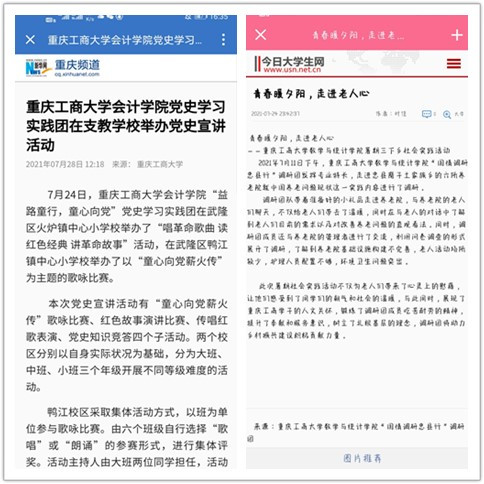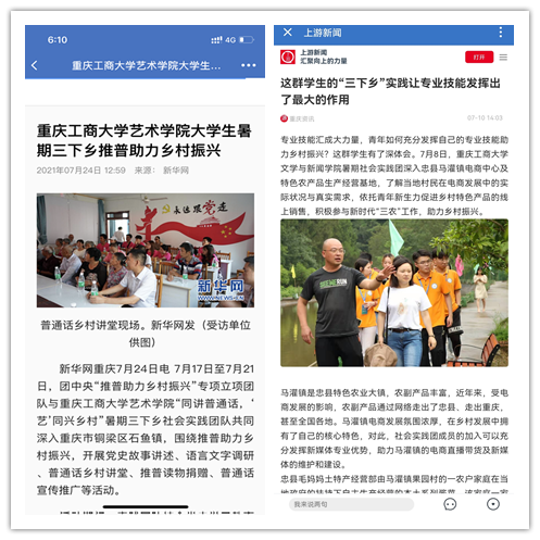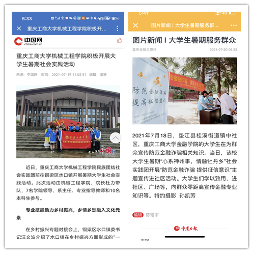 在实践活动期间,各学院创作多种类型的高质量社会实践作品,如《益路童行,童心向党--米兰网站会计学院党史学习实践团在支教学校举办党史宣讲活动》《重庆工商学子赴古蔺县 看贫困户"搬"出幸福新生活》《返乡创业敢为先 乡村振兴正当时——米兰网站经济学院助力乡村振兴在行动》《脱贫不忘来时路,乡村振兴靠大家——米兰网站工商管理学院暑期“三下乡”实践团深入重庆市巫山县下庄村》等,引领广大青年学生在扎根中国大地的生动实践中增强“四个意识”、坚定“四个自信”、做到“两个维护”。实践团深入乡村基层,走访调查,理论宣讲,服务社会,在社会实践的亲身经历中受教育、长才干、做贡献,得到了当地群众及社会的认可,同时实践活动被新华网、人民网、中国青年网、央广网、中国网、中视网、重庆晚报、上游新闻、中国教育在线等多家媒体报道。