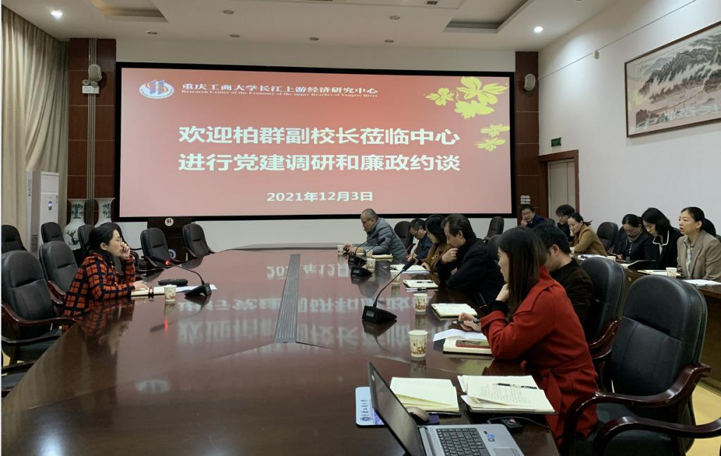 12月3日上午,副校长柏群到长江上游经济研究中心调研全面从严治党工作,开展廉政约谈。经济学院党委书记李自维,长江上游经济研究中心副主任饶光明、易淼及全体职工参加了会议。会议由李自维主持。