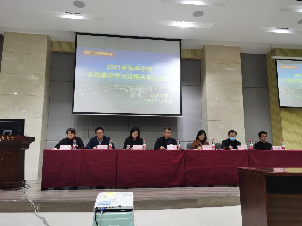 李敬勉励全体教职工要积极响应党中央号召,紧密团结在以习近平同志为核心的党中央周围,认真学习党的十九届六中全会精神,在校党委的坚强领导下,牢记为党育人、为国育才初心使命,牢牢把握立德树人根本任务,锐意进取、砥砺前行,进一步发扬为民服务孺子牛、创新发展拓荒牛、艰苦奋斗老黄牛的精神,传承和发扬好经济学院“敬道养正、励学修远”精神,在学院发展中奋发作为、勇担使命,谱写经济学院新的时代华章。