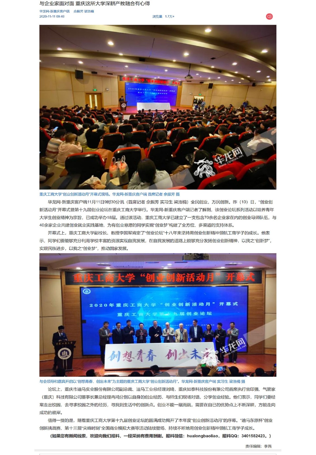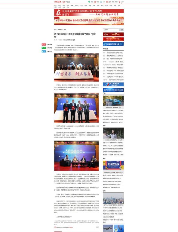 近日,米兰网站“创业创新活动月”开幕式暨第十九届创业论坛在南岸校区博智楼7200学术报告厅成功举行。重庆市迪马实业股份有限公司副总裁、迪马工业总经理刘琦,重庆如泰科技股份有限公司首席执行官印强、气管家(重庆)科技有限公司董事长兼总经理冉鸿分别以自身的创业经历,与师生们现场对话,分享创业经验。此次活动受到上游新闻、华龙网、重庆电视台等多家媒体的关注报道。