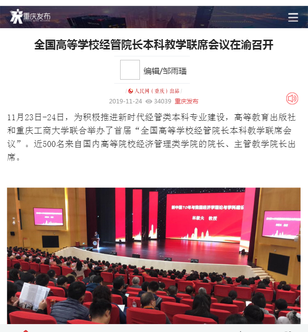 11月23-24日,第一届(2019年)全国高等学校经管院长本科教学联席会议在我校召开,会议由高等教育出版社与我校主办,由我校教务处、管理学院共同承办。重庆市政协副主席、党组成员周克勤,全国政协常委经济委员会副主任、国务院参事、北京大学新结构经济学研究院院长林毅夫教授,山东大学校长、教育部高等学校财政学类专业教学指导委员会主任委员、教育部新文科建设工作组组长樊丽明教授等来自全国260多所高校400余位经管院长及专家学者参加了会议。