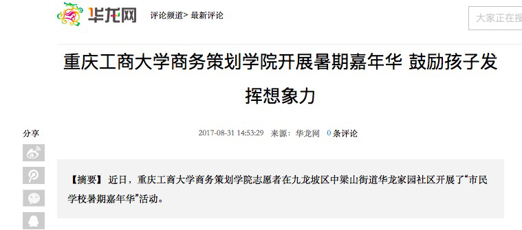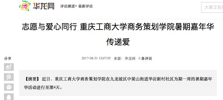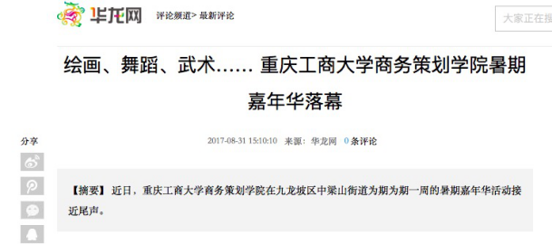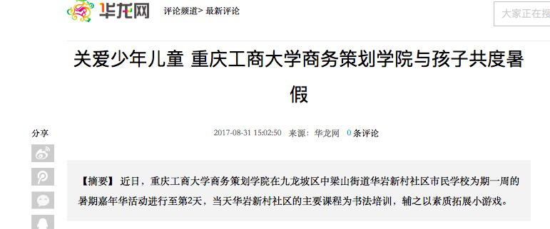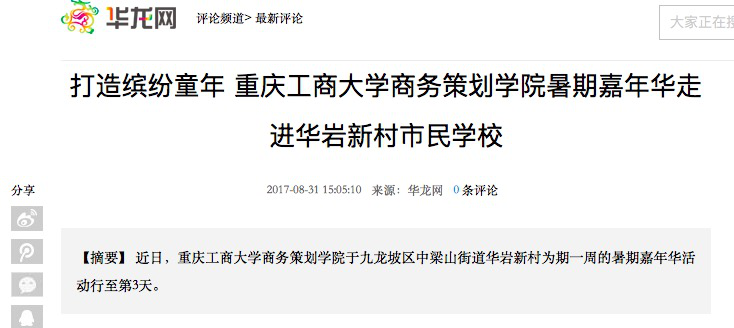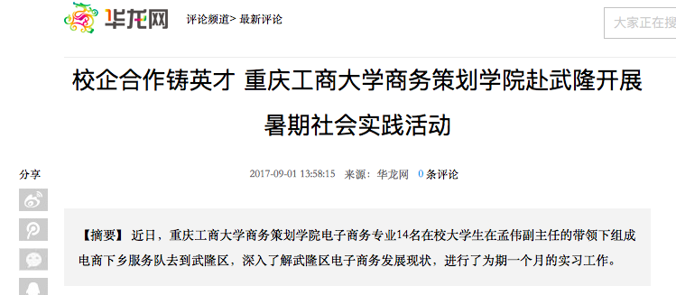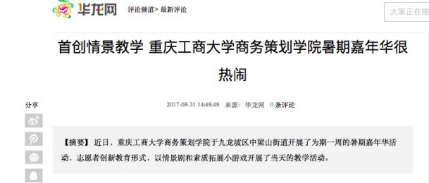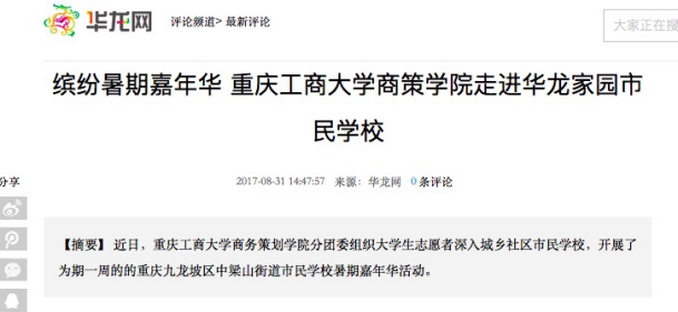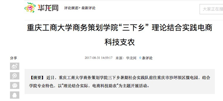 暑期两月,商务策划学院三下乡暑期实践社会队响应全国大中专学生志愿者暑期文化科技卫生“三下乡”社会实践活动号召,前往重庆多地,以理论结合实践,助力科技发展为目标;结合自身专业特色,以科技服务社会为目标,深入城乡社区,展开一系列助农、助教、调研农村电商发展等活动。实践期间,队员们结合工作实际,落实调研任务,虚心学习,悉心授课,最终团队取得了优异成果!而与此同时,该实践队的突出表现也受到了社会各界媒体的广泛关注和报道。