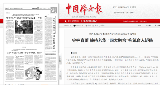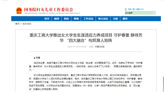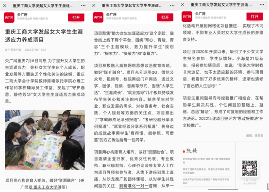近日,中国妇女报、央广网等媒体报道了我校发起并推广的女大学生生涯适应力养成项目。该项目依托会计学院心理工作站及我校辅导员工作室,围绕女大学生生涯适应力提升目标,通过媒体融合、人员融合和阶段融合,借助多样化活动,致力于协助女大学生个人成长和职业发展。相关报道被国务院妇女儿童工作委员会官方网站、腾讯网、搜狐网等多家媒体转载。