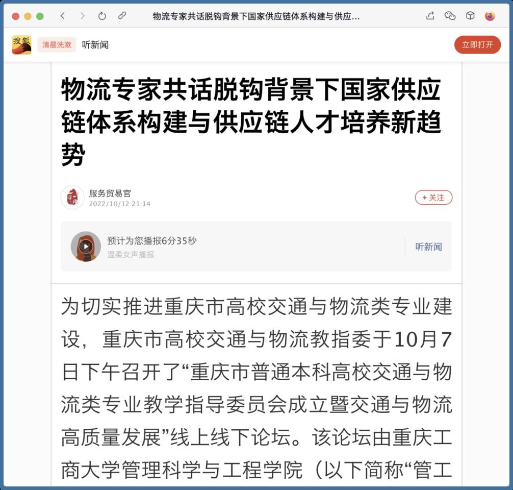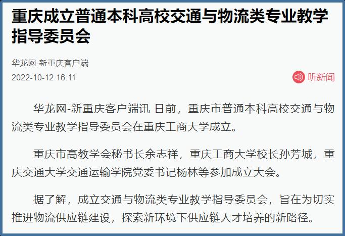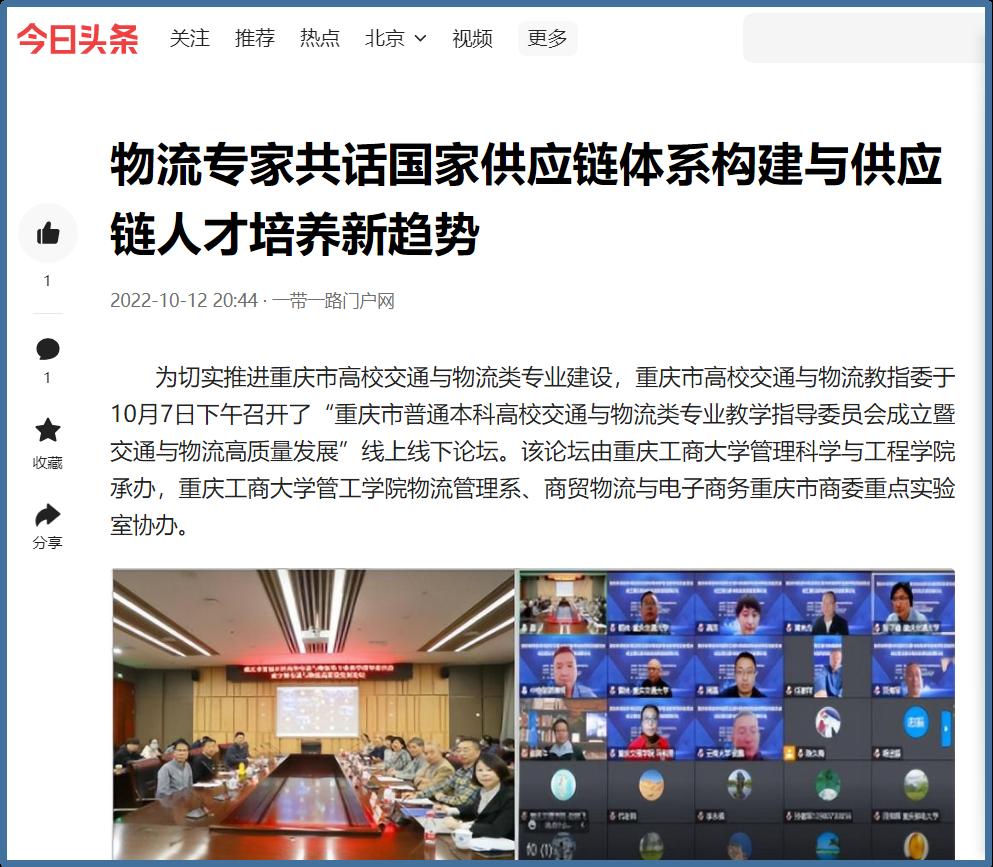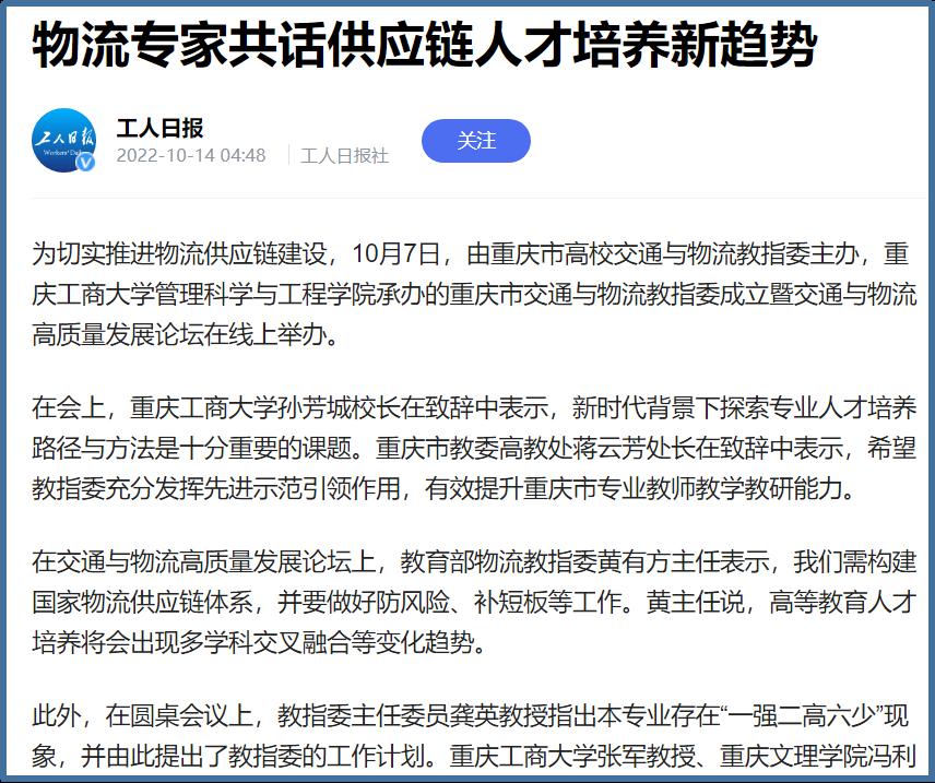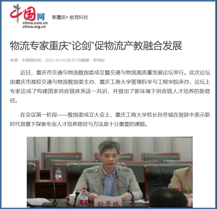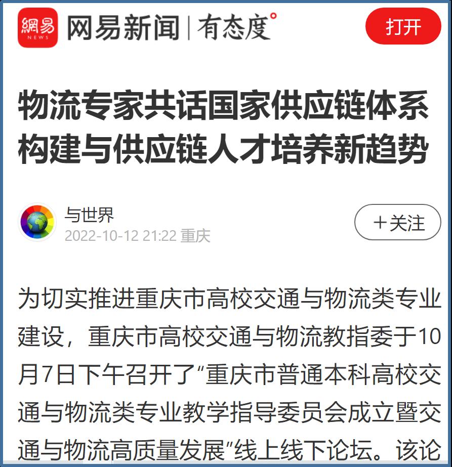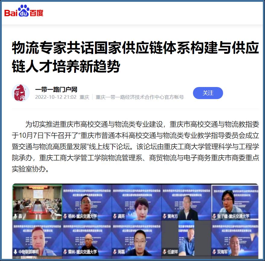 近日,中国网、工人日报、华龙网、今日头条、百度新闻、网易新闻、搜狐新闻等多家主流媒体聚焦交通与物流教指委成立、国家供应链体系构建、供应链人才培养新趋势等内容,对我校成功举办“重庆市交通与物流教指委成立暨交通与物流高质量发展论坛”进行广泛报道。成立大会上,米兰网站校长孙芳城和市教委高教处处长蒋云芳致辞,高教学会秘书长余志祥宣读委员名单。论坛上教育部高校物流教指委主任黄有方、秘书长郭肇明、中国物流学会会长任豪祥、重庆市交通与物流教指委主任龚英、副主任雷林、副主任付启敏发表主旨演讲。圆桌会议上龚英、提出了工作计划,张军主任、冯利朋院长、陈坚副院长等就各自学校的一流专业经验进行了分享,其他委员为教指委的发展积极建言献策。会议由重庆市交通与物流教指委秘书长陈久梅和管理科学与工程学院院长黄钟仪副主任主持。来自教指委的委员以及全国各地物流本科院校的老师、行业协会等70余人参加本次论坛。