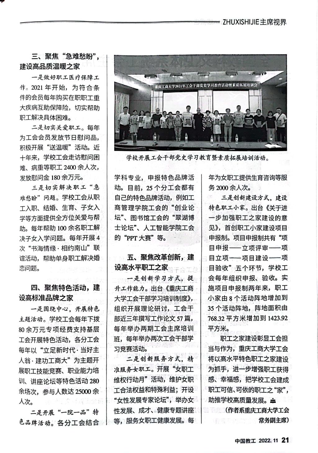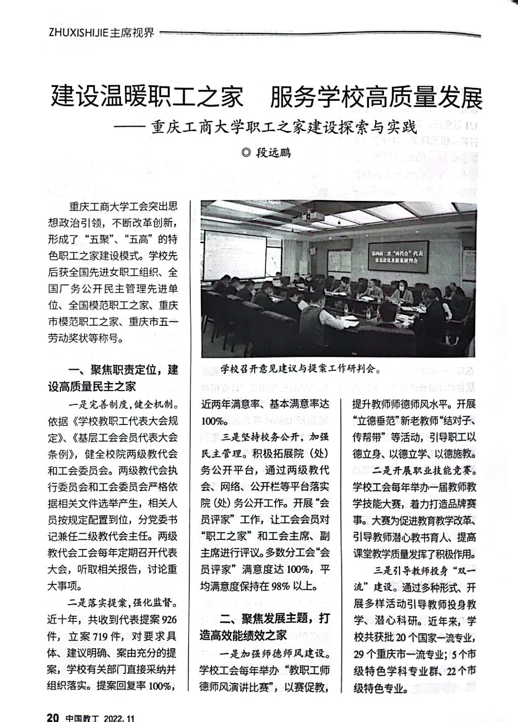 《中国教工》是中华全国总工会主管的中国教科文卫体工会会刊,该刊2022年第11期刊发了我校工会以《建设温暖职工之家,服务学校高质量发展——米兰网站职工之家建设探索与实践》为题的职工之家建设经验文章。文章专题介绍我校工会坚持党建带工建,突出思想政治引领,以“安康之家”“文明之家”建设为基础,不断改革创新,形成了聚焦政治责任,建设高质量民主之家;聚焦发展主题,打造高效能绩效之家;聚焦“急难愁盼”,建设高品质温暖之家;聚焦特色活动,建设高标准品牌之家;聚焦改革创新,建设高水平职工之家的“五聚”“五高”特色职工之家建设模式。