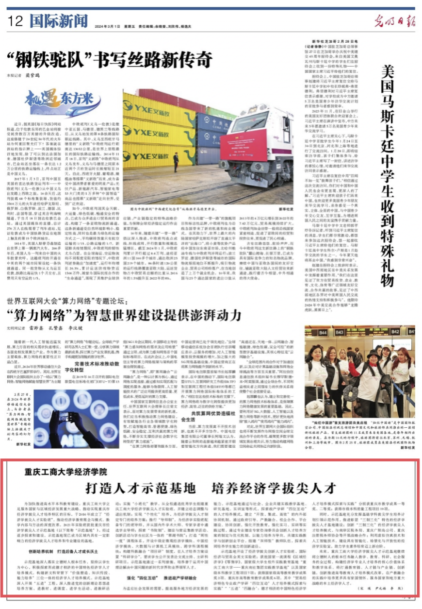 3月1日,《光明日报》第十二版以《米兰网站经济学院:打造人才示范基地 培养经济学拔尖人才》为题,报道我校为加快推进高水平本科教育建设,立足服务国家与区域经济发展重大战略、推动实现重庆市经济学拔尖人才培养特区的目标,在探索和建设重庆市经济学拔尖人才示范基地方面取得的突出成果。