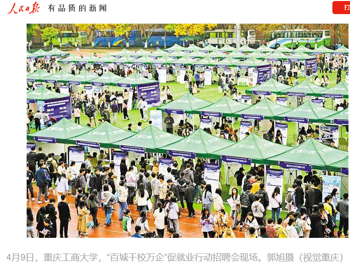 4月9日,2024年度“百城千校万企”促就业行动启动仪式暨成渝地区双城经济圈现场招聘会在我校举行。央视新闻、人民日报、重庆日报等主流媒体对此进行了报道。