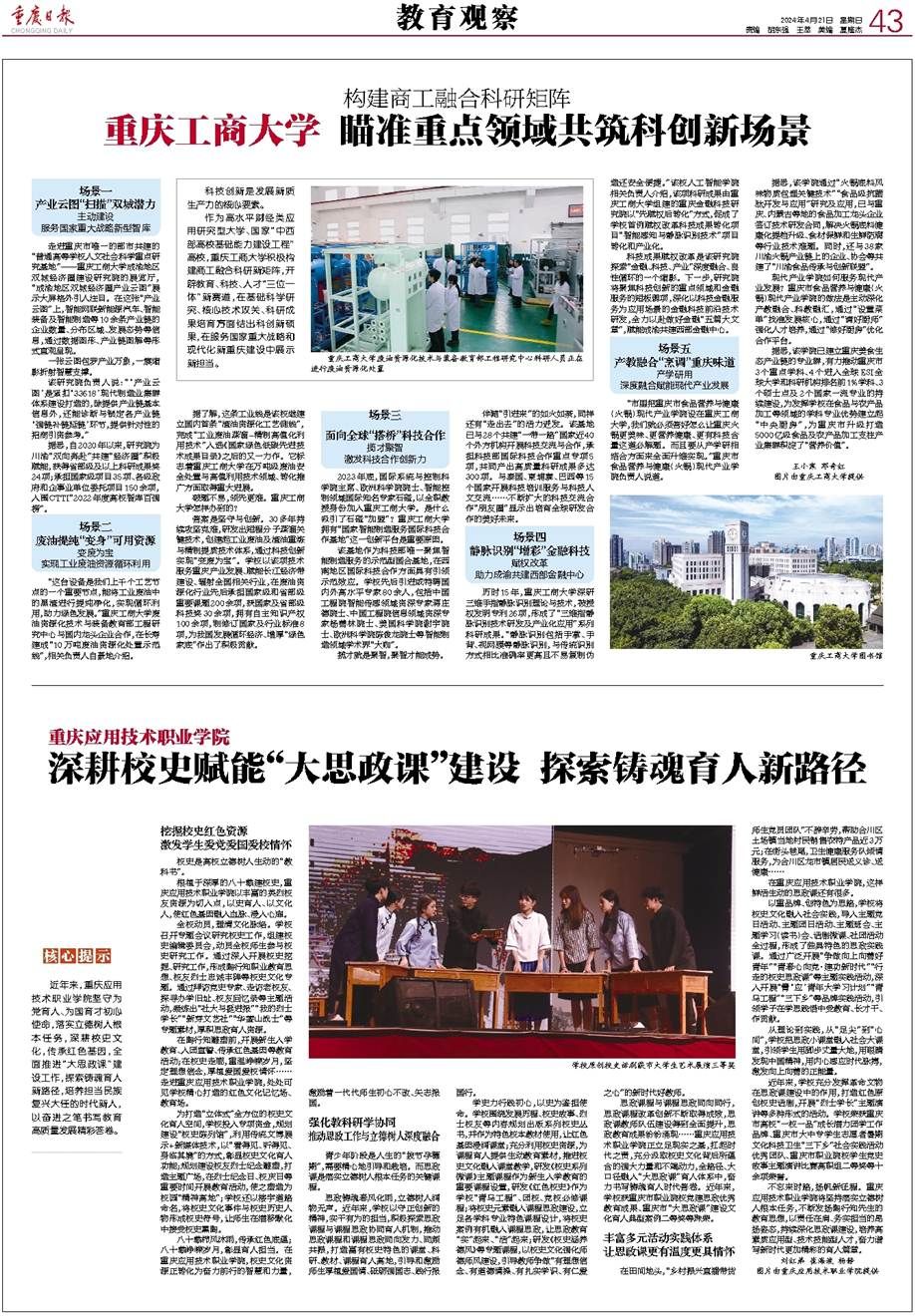 4月21日,《重庆日报》第43版以《构建商工融合科研矩阵——米兰网站 瞄准重点领域共筑科创新场景》为题,报道我校积极构建商工融合科研新矩阵,开辟教育、科技、人才“三位一体”新赛道,在基础科学研究、核心技术攻关、科研成果培育方面结出科创新硕果,在服务国家重大战略和现代化新重庆建设中贡献了“重庆工商大”力量。
