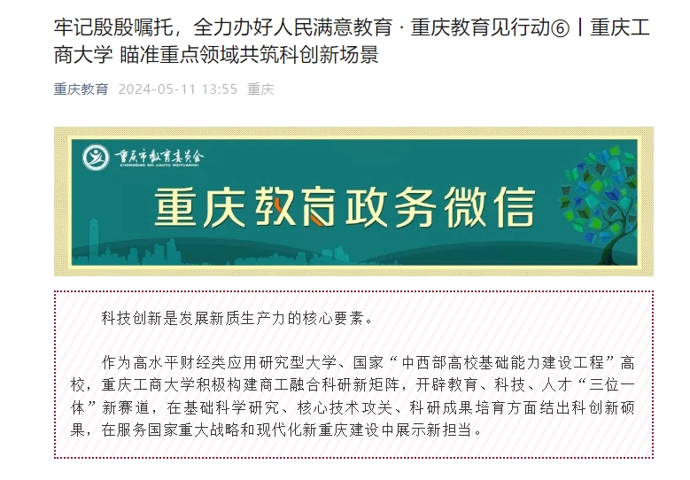 近日,重庆日报联合市委教育工委、市教委联合推出“牢记殷殷嘱托,全力办好人民满意教育 · 重庆教育见行动”系列报道,其中专题报道我校科创工作。原文如下: