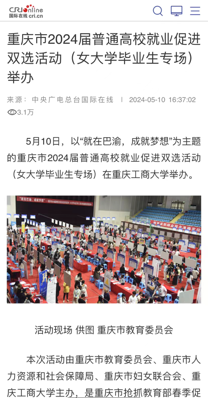 央广网、中央广电总台国际在线等媒体报道我校承办的重庆市2024届普通高校就业促进双选活动(女大学毕业生专场)