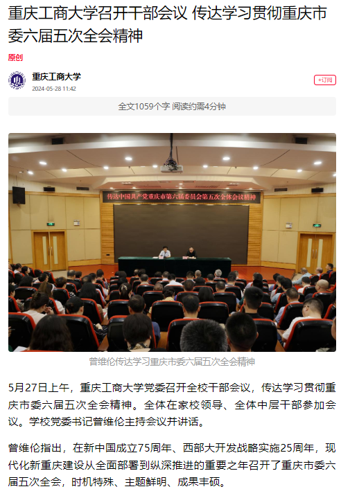 5月27日上午,我校党委召开全校干部会议,传达学习贯彻重庆市委六届五次全会精神。重庆市委党建门户网站“七一网”对此进行报道。