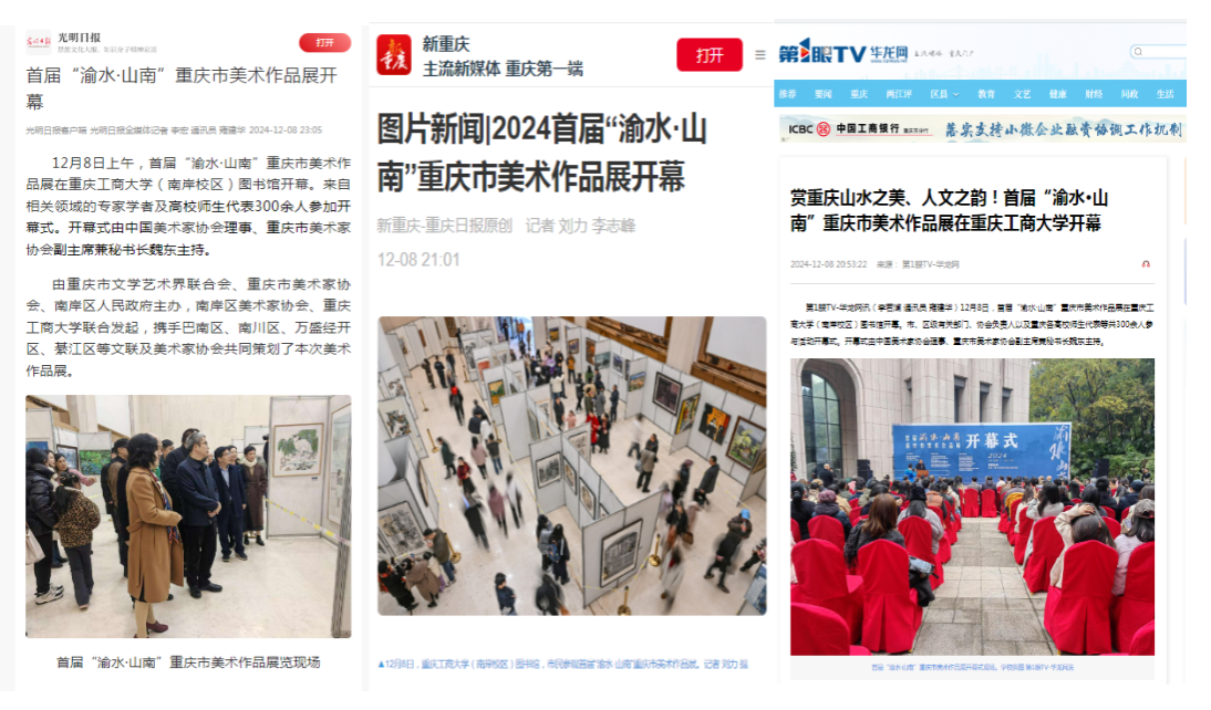 光明日报、重庆日报、华龙网等分别以《首届“渝水·山南”重庆市美术作品展开幕》《2024首届“渝水·山南”重庆市美术作品展开幕》《赏重庆山水之美、人文之韵!首届“渝水·山南”重庆市美术作品展在米兰网站开幕》为题,报道美术作品展。