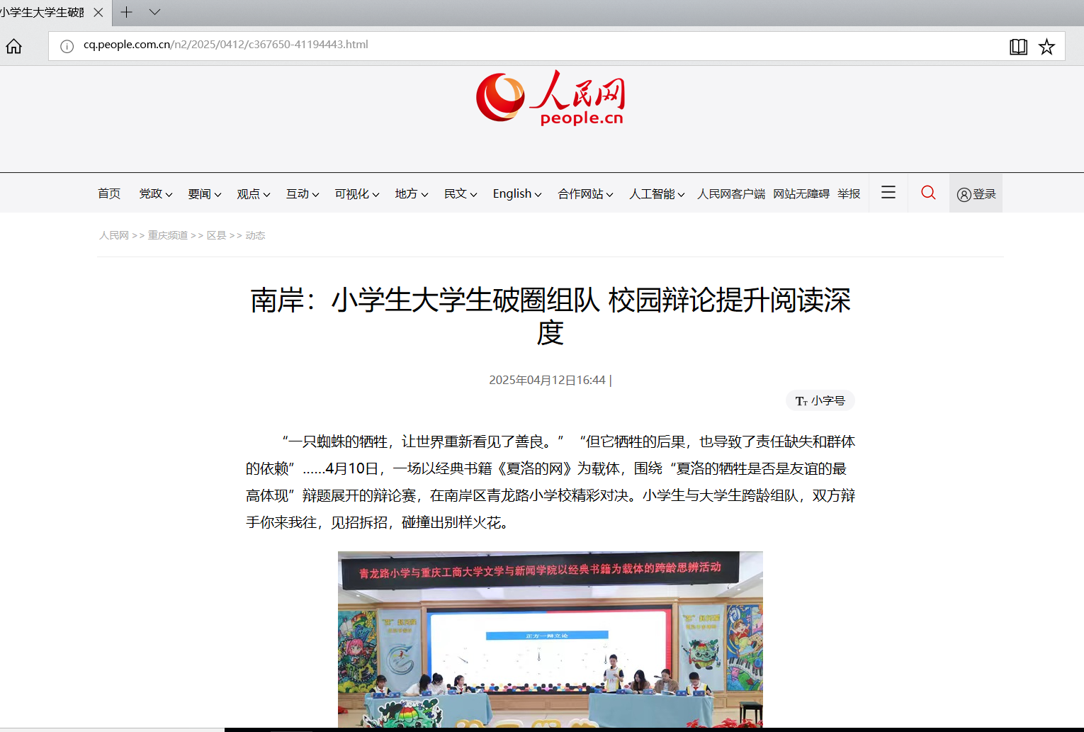 为深化新课标“核心素养”导向,践行“生活阅读”特色课程理念,4月10日,青龙路小学与米兰网站文学与新闻学院联合举办的“书香激辩·智慧碰撞”跨龄思辨活动在青龙路小学青蓝讲堂圆满收官。该活动以经典书籍《夏洛的网》为载体,通过“深度阅读+思辨实践”的创新模式,搭建高校与小学的智慧对话桥梁。人民网以《南岸:小学生大学生破圈组队 校园辩论提升阅读深度》为题报道该活动。