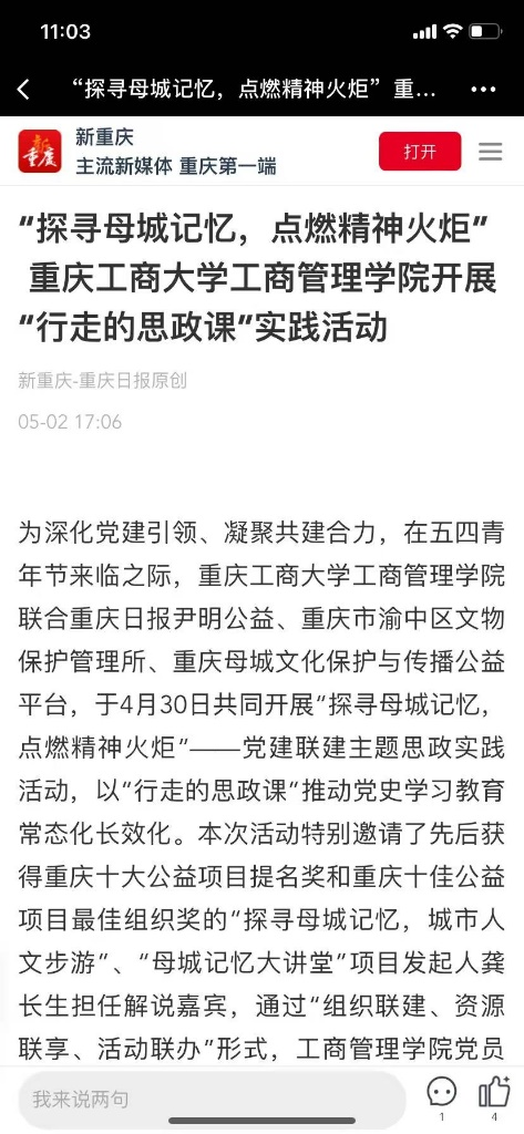 2.新重庆-重庆日报:《“探寻母城记忆,点燃精神火炬”米兰网站工商管理学院开展“行走的思政课”实践活动》