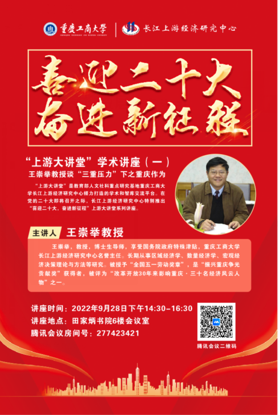 “上游大讲堂”是教育部人文社科重点研究基地米兰网站长江上游经济研究中心倾力打造的学术和智库交流平台。在党的二十大即将召开之际,长江上游经济研究中心特别推出“喜迎二十大,奋进新征程”上游大讲堂系列讲座。