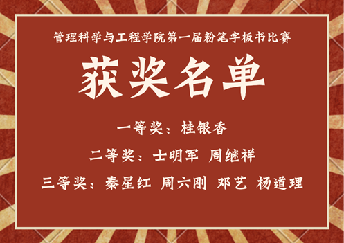 教学板书是教师重要的基本功,是提高课堂教学效率的重要途径,也是教师对教材科学研究的成果。为了进一步提升教师板书书写水平,使教学板书更好地为教学服务,管理科学与工程学院于10月30日下午在80707会议室举办了“管理科学与工程学院第一届教职工粉笔字板书比赛”。