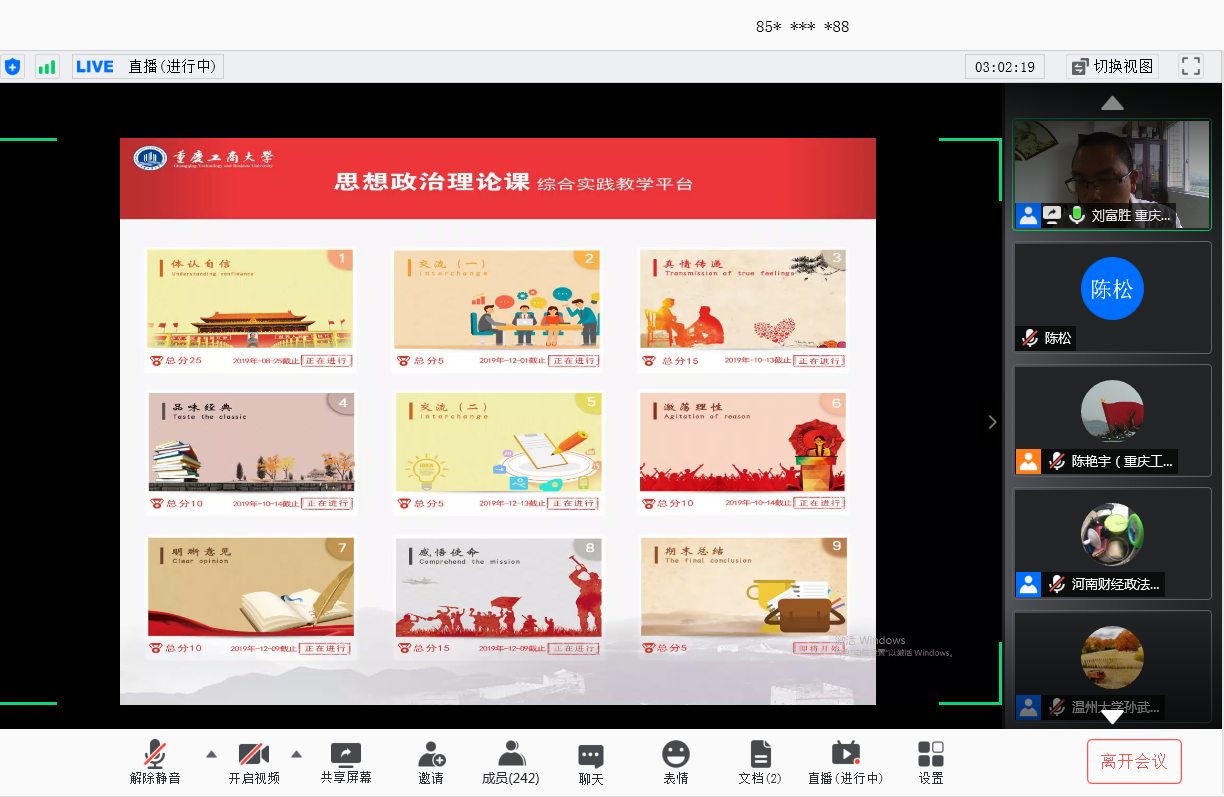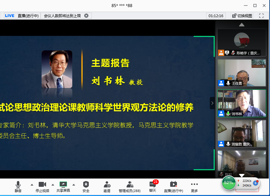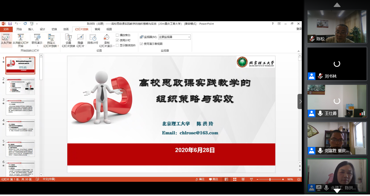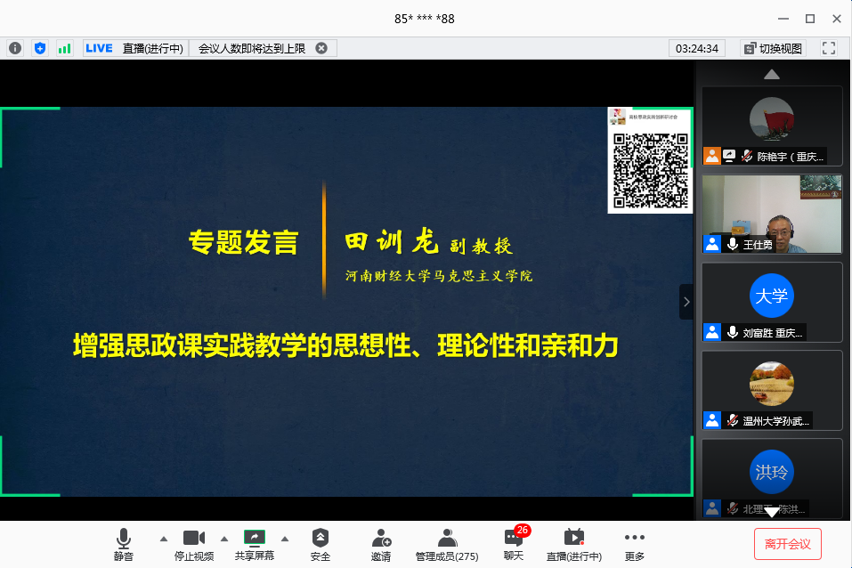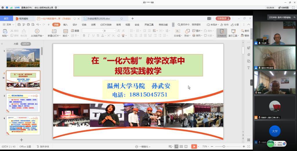 我校刘富胜教授分享了“高校思想政治理论课‘全覆盖两结合三支撑’综合实践改革”为题,介绍了“六大模块”和“十大环节”的教学设计,以及疫情期间我校通过“思想政治理论课综合实践”课程对学生进行安全教育、思想引领和心理疏导,激发了教师参与教学的积极性和主动性,增强了学生的认同感和获得感。
