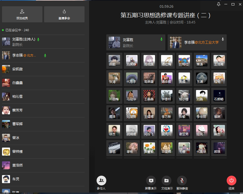 4月22日晚,北方工业大学马克思主义学院李志强教授应邀通过企业微信平台在线为我校“习近平新时代中国特色社会主义思想研究”选修课作了题为“坚持依法治国与以德治国相结合”的专题学术报告。李志强教授是中央马克思主义理论研究与建设工程专家、北京市思想道德修养与法律基础研究会副秘书长,北京市优秀教师,北京市思想政治理论课特级教师。学校党委常委、副校长何勇平,马克思主义学院院长王仕勇、副院长刘富胜,部分思政课专兼职老师、“习近平新时代中国特色社会主义思想研究”选修课第五期232名学员,参加了此次“云”端报告会。本次会议由刘富胜主持。