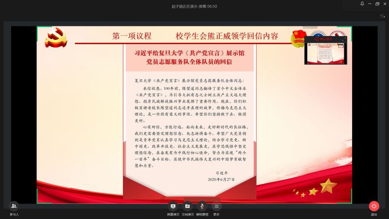 近日,习近平总书记给复旦大学青年师生党员回信,勉励广大党员在学思践悟中坚定理想信念,在奋发有为中践行初心使命,在我校青年中引发热烈反响。7月5日下午,校团委组织200余名学生组织代表在企业微信平台开展主题团日活动,集中学习习近平总书记回信精神。